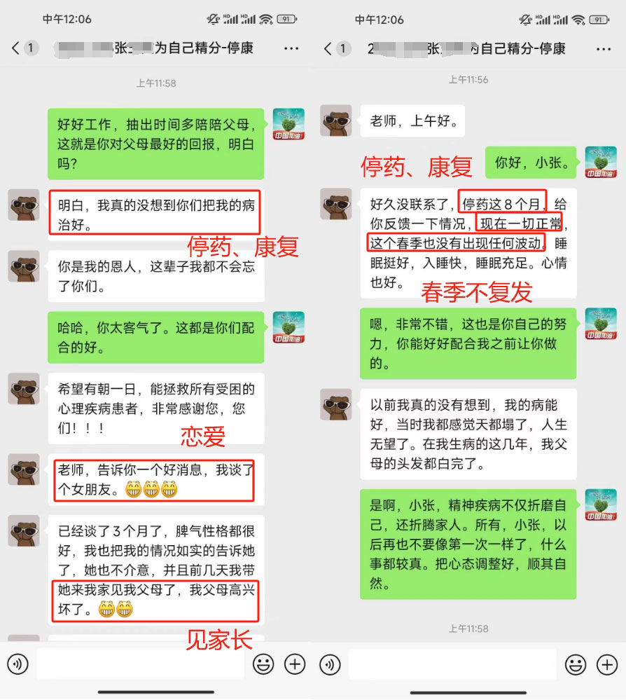 当父母的盼什么?不就是盼孩子们健健康康、成家有个伴吗?小儿被精神病耽误了七八年,好在最后治好病成了家,儿媳妇有了喜,妇产科大夫说,大人孩子都很好 。如果不是遇见这位医生和他的团队,如果不是信任他,小儿就不会娶妻成家,我们家就不会有今天的踏实日子。我太清楚以前的日子不是人过的,不想别的小孩被精神病折磨,所以今天把小儿治好的经过写出来,希望能救一部分人,算是感恩积德吧。